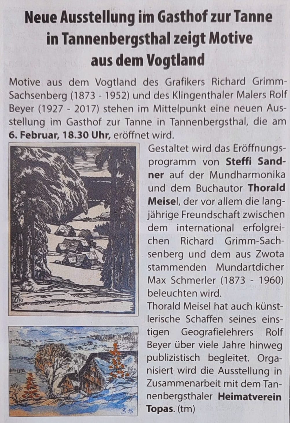 06.02.2026, 18:30 Uhr, „Motive aus dem Vogtland von Richard Grimm Sachsenberg und Rolf Beyer“, Ausstellungseröffnung im Gasthof zur Tanne in Tannenbergsthal