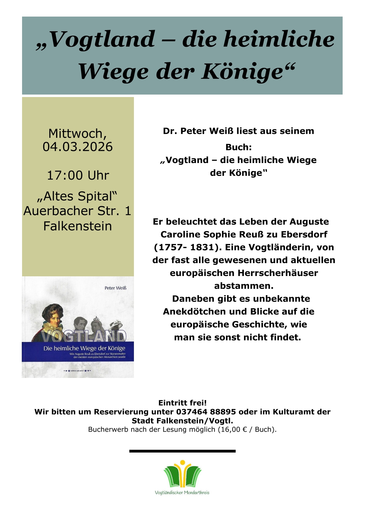 04.03.2026, 17:00 Uhr, „Vogtland - die heimliche Wiege der Könige" Vortrag mit Dr. Peter Weiß aus Lengenfeld im Alten Spital